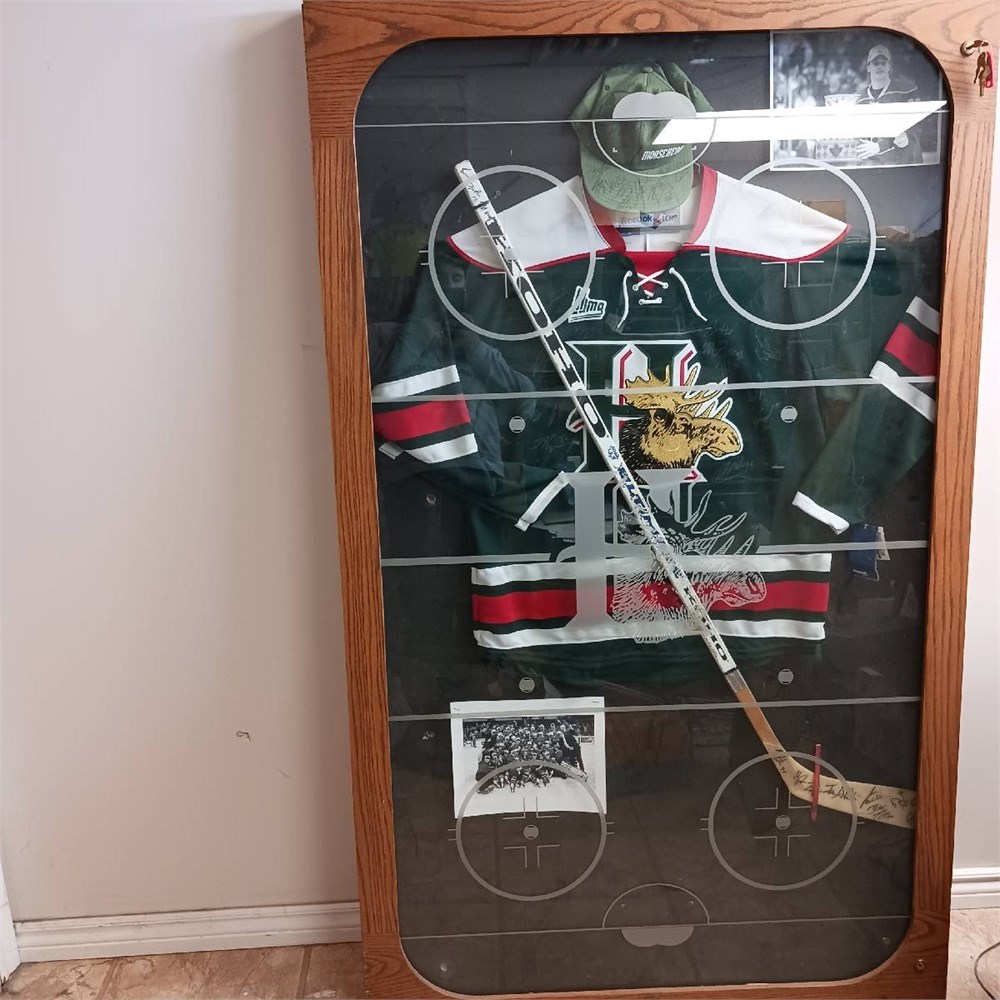 Enclosed in Locking hanging Case. Jersey, stick and hat signed by team