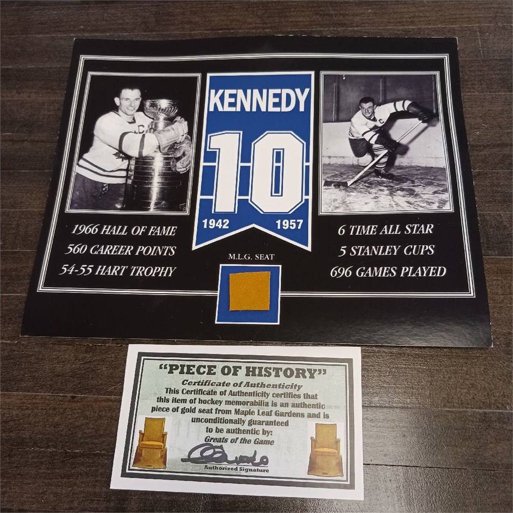Ted Kennedy picture with Authentic piece of Maple Leafs garden seat attached
